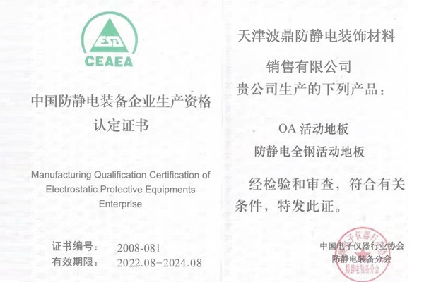 中國防靜電裝備企業(yè)生產(chǎn)資格認定證書